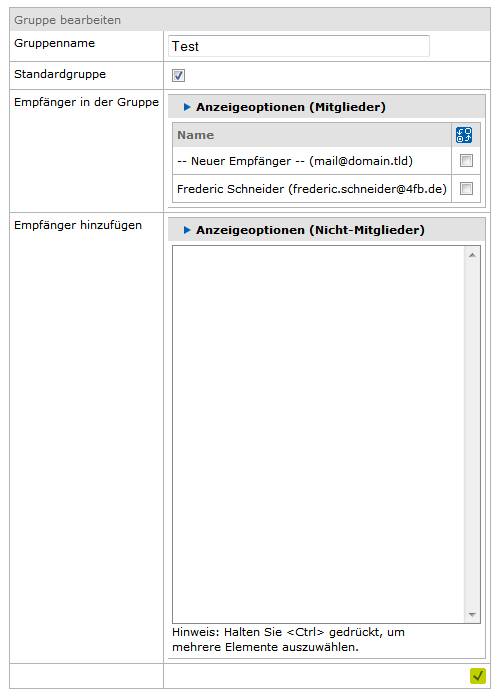 - Empfängergruppen: Die Klappbox "Anzeigeoptionen (Mitglieder)" funktioniert nun wieder - besten Dank an CinKon und 4fb! Der Bereich direkt darunter ("Navigation/Mitglieder") geht leider immer noch nicht auf. Beim Anklicken erfolgt keine Reaktion, die Fehlerkonsole vom Browser zeigt aber auch keine Fehler an.
