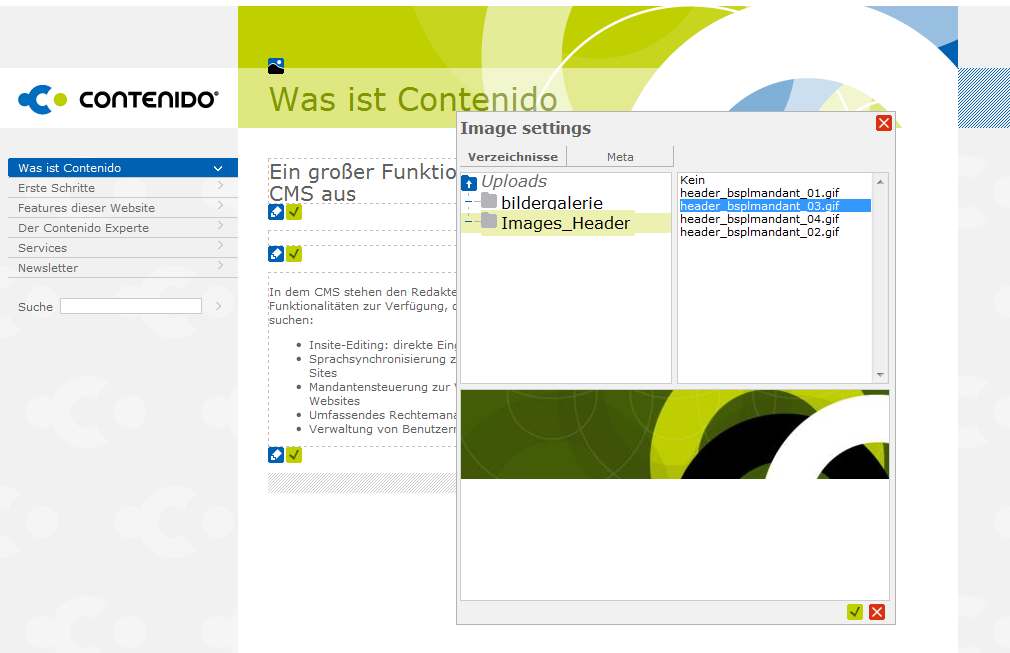 Das wird sich ändern. Für CONTENIDO 4.9 wird diese Funktion von Grund auf modernisiert. So können dann die Bilder über eine dynamische Baumstruktur ausgewählt werden. Diese Baumstruktur repräsentiert die Ordner der Dateiverwaltung. Diese Baumstruktur wird in einem Layer direkt im Editor-Fenster visualisiert, so dass ein aufwändiges Wechseln in ein anderes Fenster entfällt. Doch - es geht noch weiter. In der Dateiverwaltung kann man dann alle erfassten Dateien mit Meta-Informationen versehen. Der neue Content-Typ kann in diesem Layer auch gleich diese Meta-Informationen darstellen und ermöglicht es auf diesem Wege die Daten direkt hier zu editieren, ohne wiederum in andere Bereiche wechseln zu können.