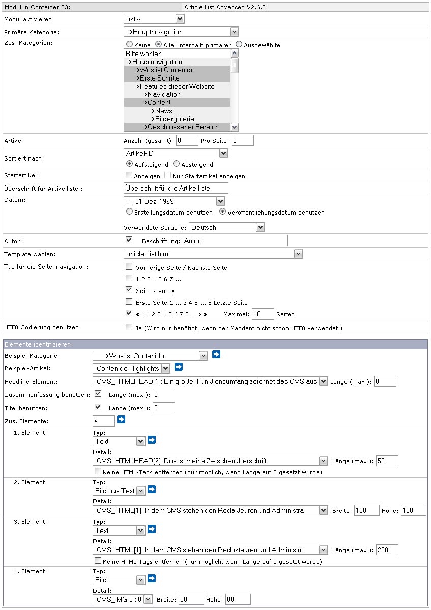 - Es können neben einer Überschrift beliebige Elemente eines Artikels angezeigt werden. Es ist sogar möglich, Text bzw. ein Bild aus dem gleichen Container mehrfach anzuzeigen
