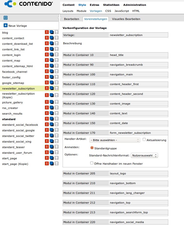Bei mir gibt es nur eine Vorlage newsletter_subscription, in der unter 'Voreinstellungen' beide Module angezeigt werden.