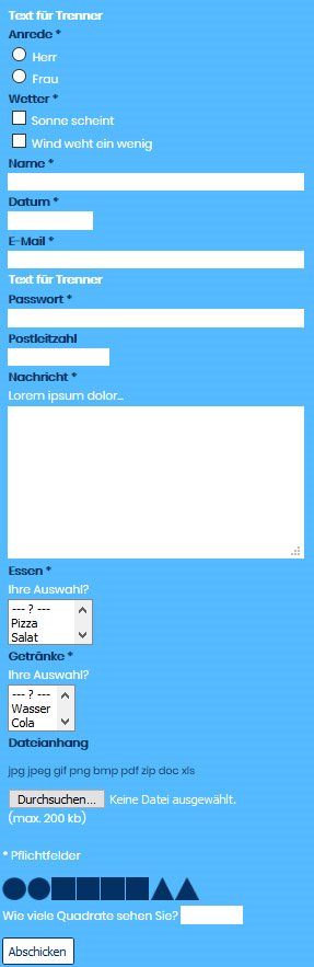 EDIT 19.02.2019: Input-Felder sind jetzt mit mit einem <label> versehen und HTML5-Funktionen (Validierung, Fehlermeldung, Datepicker, …) aktivierbar. Der Eingabetyp "range" ist hinzugekommen.
