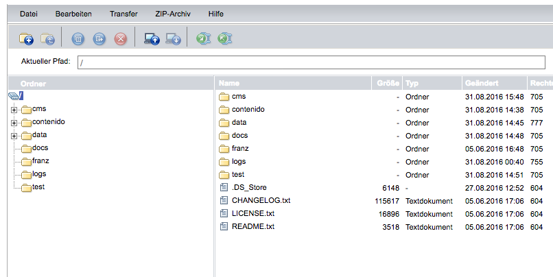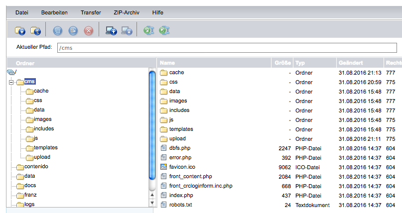In den beiden Bildern haben die Datei nur 604 als Rechte stehen.homtata hat geschrieben:hast du auch die Schreibrechte für cms/data und alle Unterordner korrekt gesetzt, so dass überhaupt Schreibrechte bestehen? z.B. 755 oder 775?