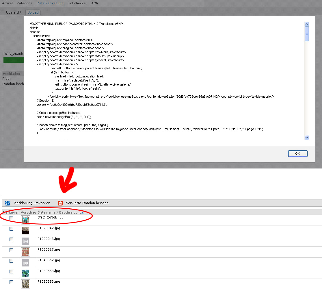 b) Upload startet sofort, im Anschluss erscheint ein Dialogfeld mit HTML-Code dessen Inhalt ich nicht kopieren und hier posten kann. Insofern Screenshot in der Anlage.
