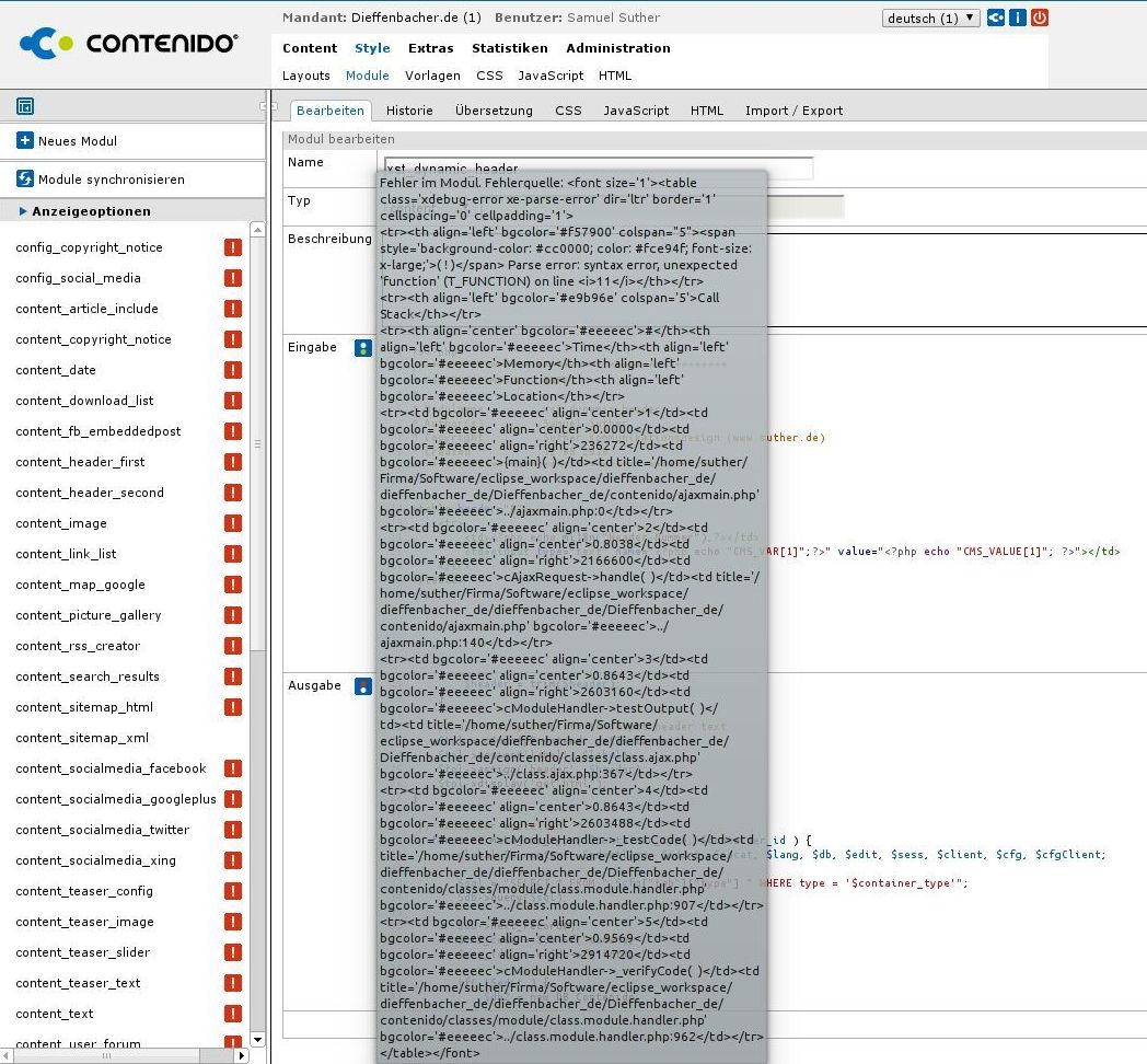 Hat man XDEBUG auf dem Server aktiviert, verändert dieses ja die Fehlermeldung mit einem Stack-Trace in leslicher Form. Wäre top, wenn Contenido dies unterstützen würde - Im Idealfall selbst ausließt, ob xdebug installiert ist, alternativ über eine Mandantenvariable "setzbar" macht.