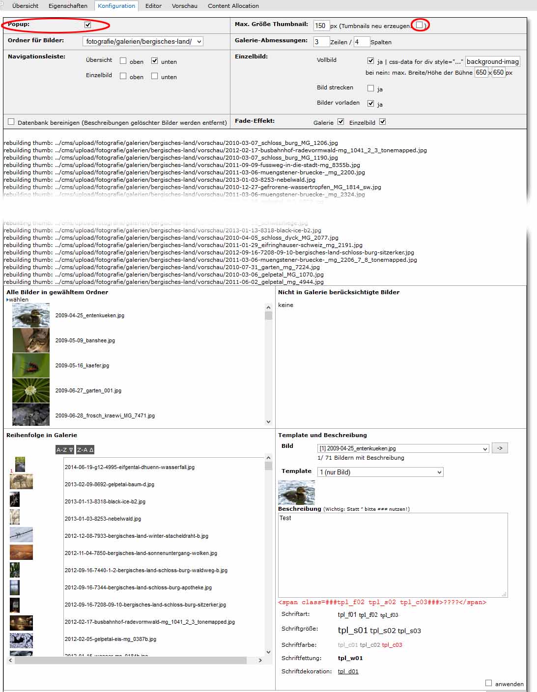 # Werden Bilder aus dem Galerieordner gelöscht, verbleiben ggf. erfasste Beschreibungen in der Datenbanktabelle. Damit die nicht im Laufe der Zeit zumüllt (in die Tabelle werden alle Beschreibungen aller Bilder sämtlicher Galerien gespeichert) kann die Checkbox "Datenbank bereinigen" im oberen Konfigurationsbereich aktiviert werden. Dann einfach irgendein Bild unten rechts bei der Templatezuordnung auswählen und beim anschließenden Speichern wird die Datenbank gesäubert. Die Statusmeldungen zur Prüfung werden rechts unten angezeigt.