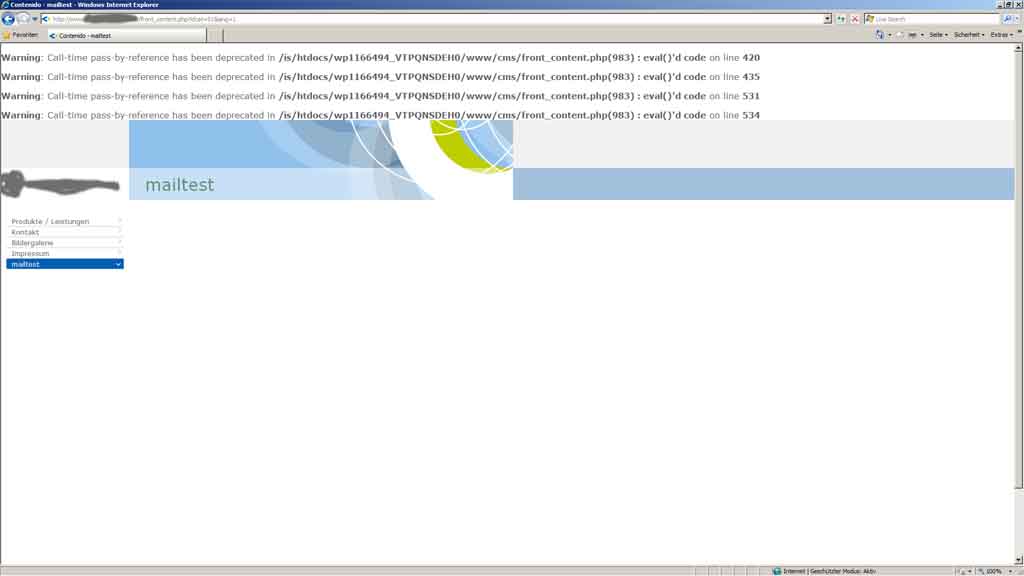 Hier tritt das gleiche Problem auf, die Kontaktmail wird nicht versendet und die Fehlermeldungen erscheinen im Contenido Erro Log. Die "Google-Lösung" (der Provider hat die "allow_call_time_pass_reference = On" gesetzt im php.ini) bietet leider keine Verbesserung. Hat jemanden ein Tipp, wie das Formular zukunftsgerecht aktualisiert werden kann? Die arguments sollten anscheinend bei value übertragen werden und nicht bei reference, laut die info im php.ini Datei: