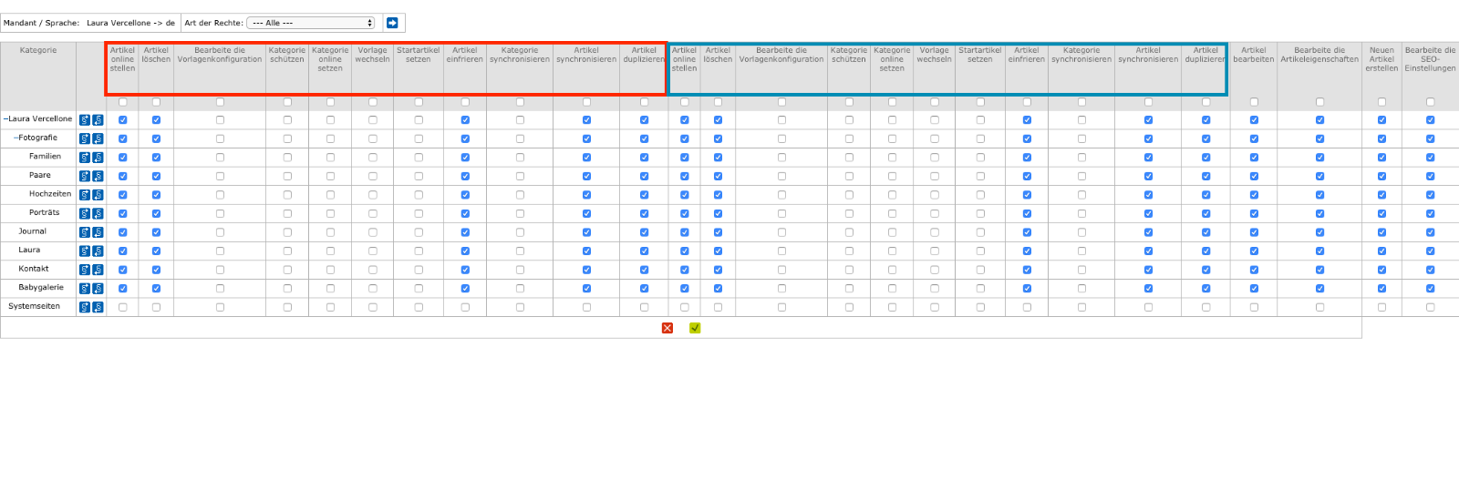 Ich will diesem Benutzer im Reiter "Content" überall Rechte vergeben ausser in einer Kategorie. Nun wollte ich hinten die Checkbox "Alle markieren" anklicken und in der entsprechenden Kategorie den Haken wegnehmen. Leider scheint das nicht zu funktionieren. Es werden nicht alle Felder markiert, sondern nur ein Teil. Siehe Screenshot: