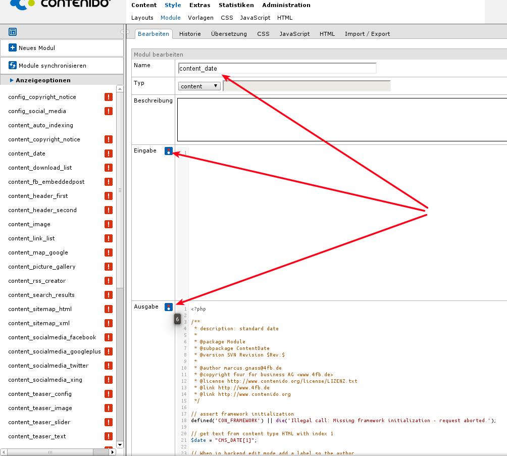 Installation mit Beispiel-Modulen und Daten. Wechselt man zu den Modulen, erscheint vor den mit ausgelieferten Modulen die Validierungslampe