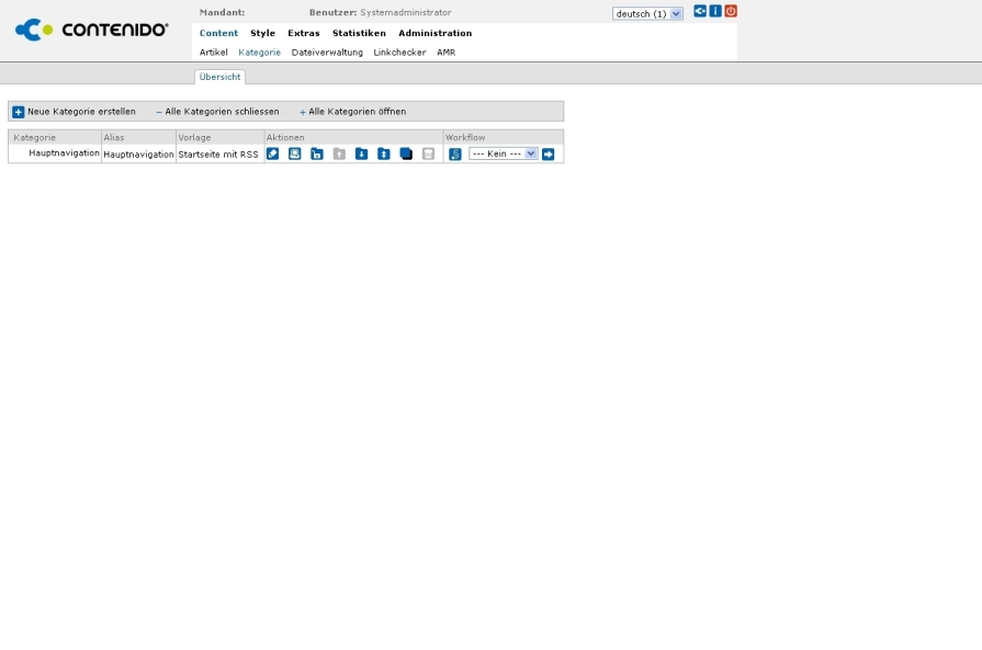 Das "+" zum Aufklappen fehlt und auch ein Klick auf den Link "+ Alle Kategorien öffnen" führt zu keinem Ergebnis. Verschiebe ich die Kategorie einen nach unten, erscheint statt dessen die Metanavigation mit der gleichen Problematik. Die Buttons der Spalte "Aktionen" sind ansonsten alle funktionsfähig. Eine neue Kategorie zu erstellen klappt jedoch auch nicht.