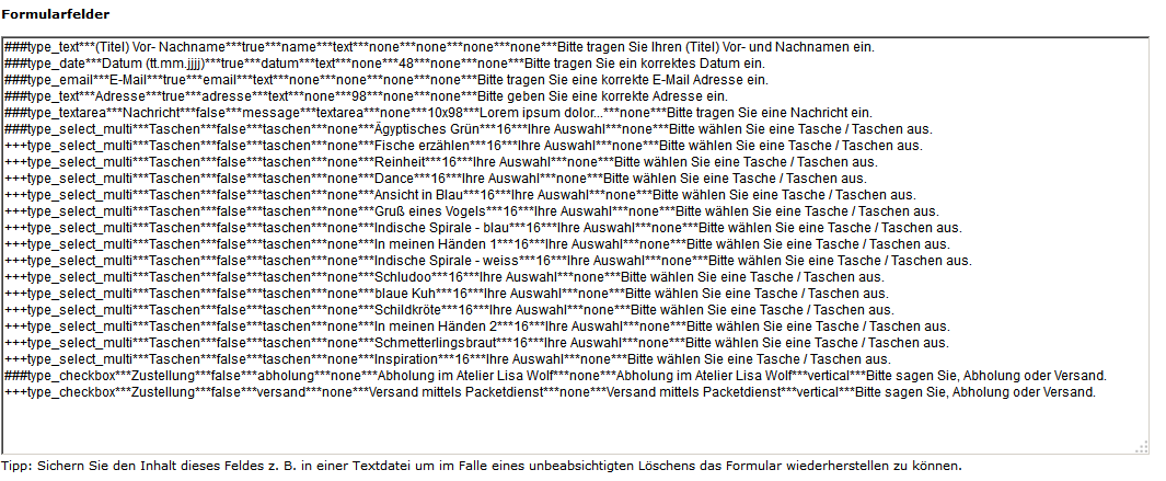 # Festlegung der Formularfelder über den Artikelreiter Konfiguration, das sind bisher folgende Typen: