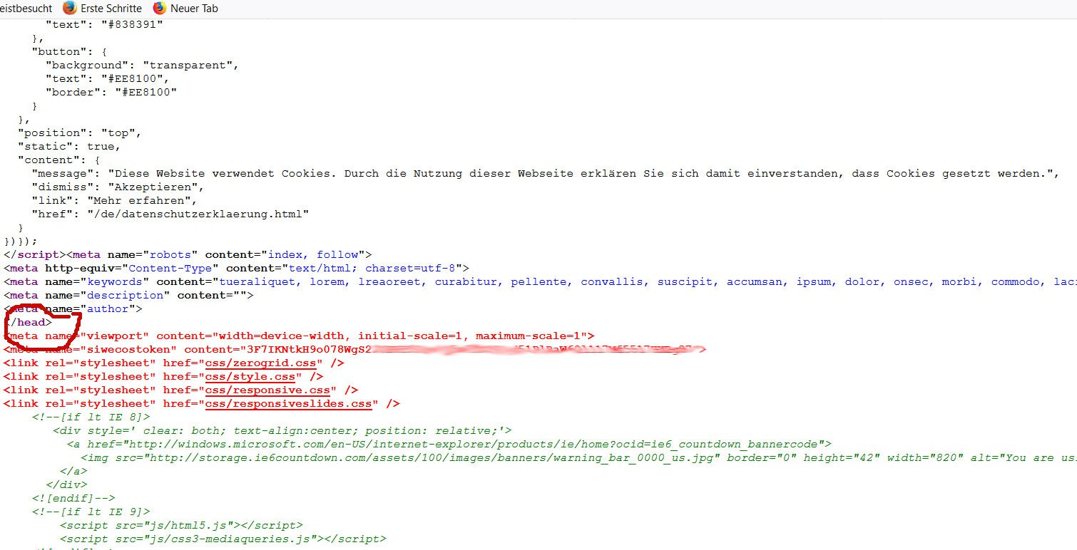 habe jetzt nochmal den gesamten Kopfbereich vom Quellcode der Webseite ausgegeben und hier verkürzt eingefügt. Mir ist aufgefallen das ein kompletter Teil doppelt ausgegeben wird. Habe die Bereiche mit ## Komentar ## markiert. Vielleicht hilft es den Fehler zu finden.