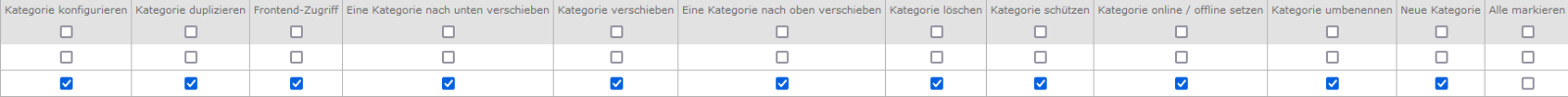 Ich habe einen neuen Benutzer zum Test angelegt und ihm unter Bereiche Zugriff auf Kategorien gegeben:
